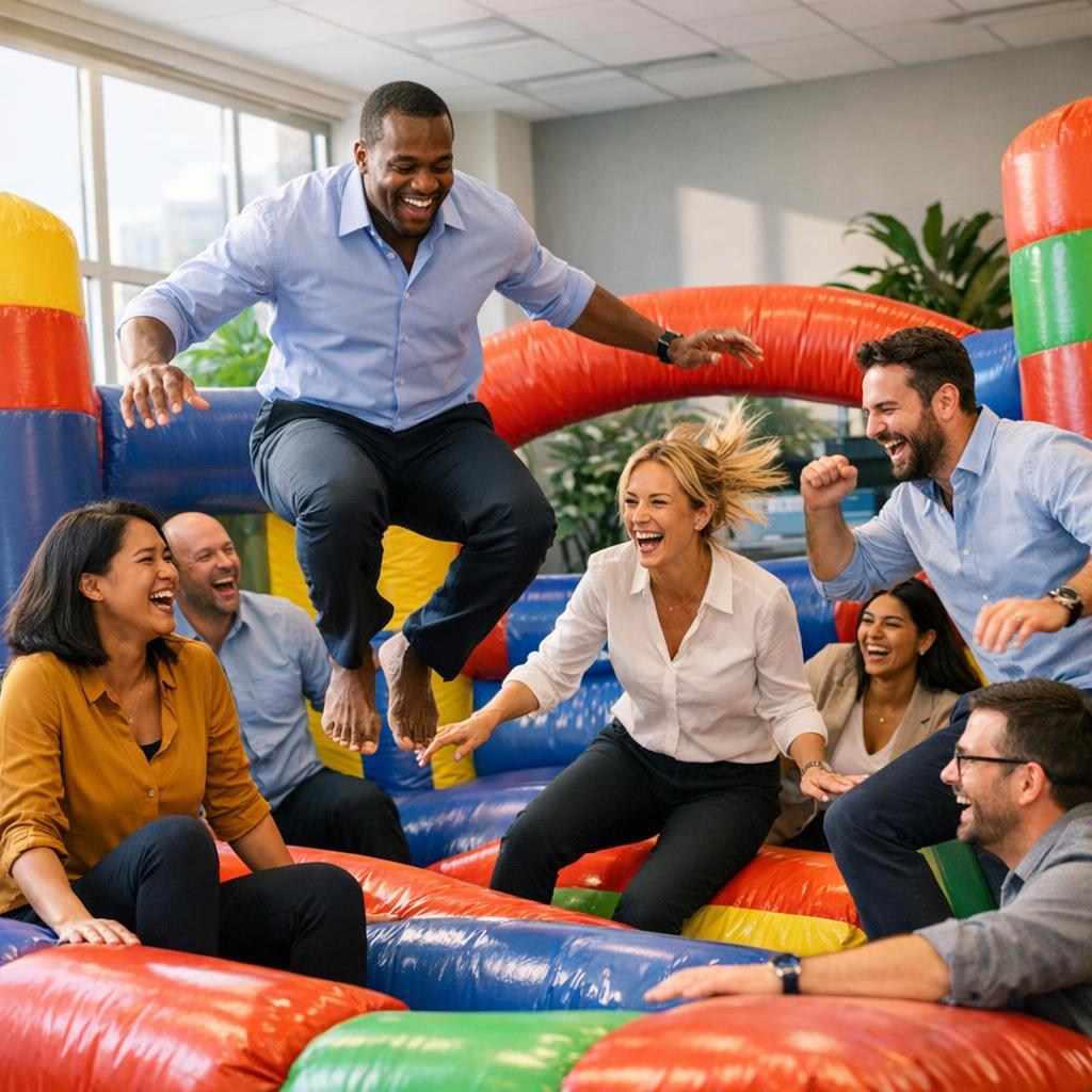 Ein Beispiel für eine spielerische Aktivität, die sowohl Bewegung als auch Teamarbeit fördert, ist die Nutzung einer Hüpfburg. Dieses ungewohnte Element bringt Spaß und Abwechslung in den Büroalltag und sorgt für gemeinsames Lachen.